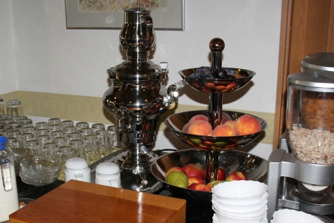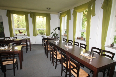 Der Speiseraum bietet allen Gästen des Hauses Platz. Er ist auch als Tagungsraum für bis zu 60 Teilnehmer geeignet.
